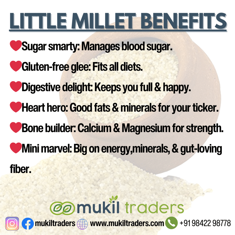 - Nutrient Powerhouse: Fiber, protein, vitamins, and minerals – little millet has it all, supporting healthy digestion, immunity, and energy levels.